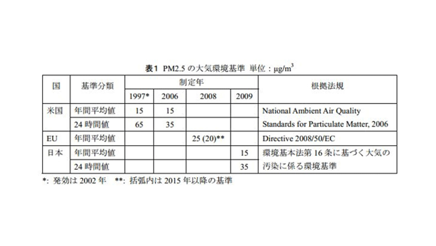 環境省による第6回環境影響評価法に基づく基本的事項に関する技術検討委員会資料4-2によれば、「PM2.5とは、大気中に浮遊する粒子状物質のうちでも特に粒径の小さいものをいう(粒径 2.5μm以下の微小粒子状物質)。PM2.5については、呼吸器の奥深くまで入り込みやすいことなどから、人への健康影響が懸念されており、欧米諸国では、独立の項目として環境目標値を設定。日本においても、このような状況を踏まえ、中央環境審議会における審議を経て、平成21年9月、PM2.5に係る環境基準を告示。」とあり、環境基準値については「年間平均値を15μg/m3以下であり、かつ、1日平均値が35μg/m3以下であること。」とされています。