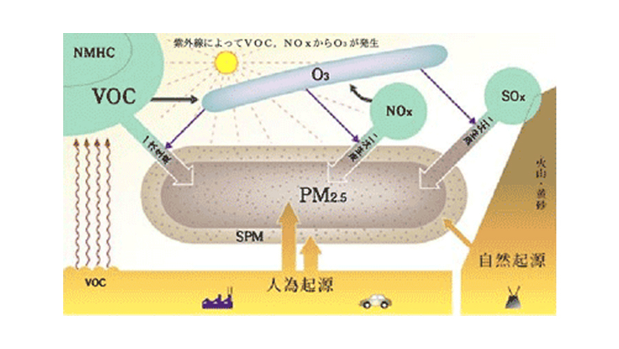浮遊粒子状物質であるSPM*やPM2.5の生成にはガス状のVOC*,NOx,SOx*そしてO₃が密接に関係しています。どこから発生するかで見ると、自然起源と人為起源に分類されます。黄砂や、火山排出物などの自然起源の粒子にはPM2.5よりも大きな粒径のものが多く含まれています。また発生源から直接、粒子として排出される一次生成粒子と大気中で反応して粒子化する二次生成粒子とに分けられます。とくに健康への影響が大きいPM2.5はVOC、NOx、SOxが化学反応を経由して二次的にも発生することが知られています。