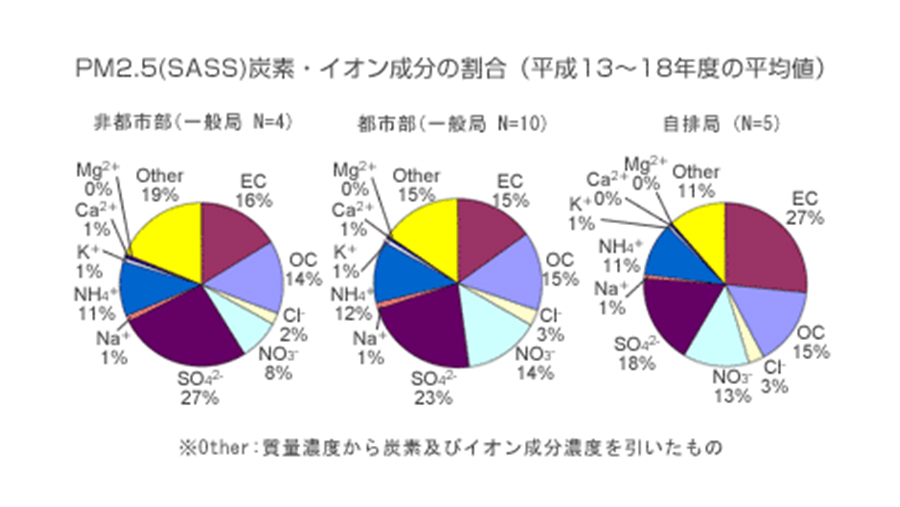 PM2.5 の主要な成分は元素状炭素(EC)、有機炭素(OC)、硝酸イオン(NO3-)、硫酸イオン(SO42-)、アンモニウムイオン(NH4+)です。