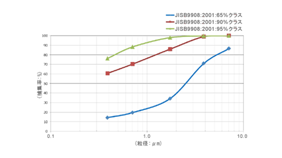 JISB9908:2001形式2(比色法)による効率65%、90%、95%クラスのフィルタ(当社製品)について、JISB9908:2011形式2による初期捕集率(計数法)を測定すると下記グラフのようになります。