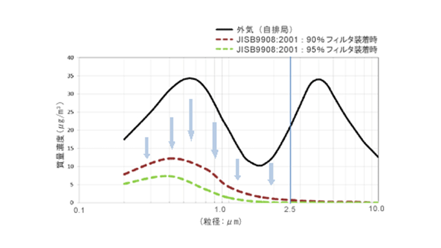 基準となる外気濃度分布は、上記<浮遊粉じん粒度分布>グラフ中最も濃度の高い自排局データを基にしています。