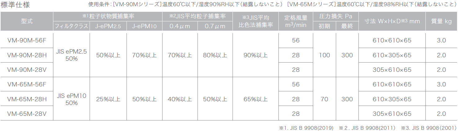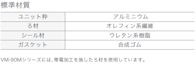 Ecoalpha™, フィロプリーツ® / 軽量・超薄型設計のベーシックな中性能ユニット型フィルタ。 製品に関するお問い合わせ 製品に関するお問い合わせはこちら 型式 VM 資料ダウンロード 環境配慮型エアフィルタ(Ecoalpha) グレード 中性能 導入場所 一般ビル・商業施設 一般工場施設 自動車関連 データセンター 半導体・電子工場 食品・飲料工場 物流・倉庫 病院・製薬工場 駅舎・地下鉄 美術館・博物館・図書館 対策内容 環境対策 種別 フィルタ 特長・強み 低圧力損失構造:シングルプリーツ構造により、通気抵抗を抑えつつ安定した集じん性能を発揮。 超軽量・薄型設計:65mm厚のアルミ枠で軽量かつ省スペース設置が可能。 帯電加工で微粒子対応:VM-90には帯電加工ろ材を採用し、微細粒子の捕集性能を強化。 標準仕様 標準材質 性能グラフ