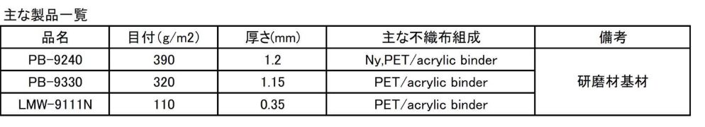 / 高密度・高均一性で研磨材の基材に最適な不織布 製品に関するお問い合わせ 製品に関するお問い合わせはこちら 品番・型式 PB-9240, PB-9330, LMW-9111N 組成 ナイロン ポリエステル ほか 製法 ニードルパンチ 水流絡合 ケミカルボンド 特長 高密度構造により安定した研磨性能を実現 厚みの均一性が高く、加工精度の向上に寄与 薄手でコシがあり、研磨材との一体化に優れる 用途に応じた厚さの選定が可能 物性表・データ 使用用途例 研磨材の基材(サンドペーパー、研磨パッドなど)